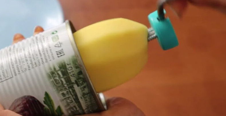 Картофельные чипсы любят и дети и взрослые, но все мы знаем, что это очень вредный продукт. Поэтому предлагаем приготовить более полезную альтернативу — жареную картошку «Спиралька». Такая закуска выглядит очень оригинально, получается вкусной. А чтобы ее приготовить, потребуется смастерить оригинальное приспособление для нарезки картофеля. Мастерим Руками/youtube Для работы понадобится: жестяная банка, высотой 10,5 см и диаметром 7 см; пластиковая бутылка объемом 1,5 литр; металлический прут; 2 шурупа. Процесс работы В центре дна консервной банки просверлите отверстие. Диаметр отверстия должен быть таким, чтобы туда поместился металлический прут. Второе отверстие сделайте у края окружности дна. Проведите между отверстиями линию так, чтобы она прошла по их краю. Разрежьте эту линию маленьким диском. Мастерим Руками/youtube Одну из прорезей немного приподнимите отверткой: должна получится щель примерно 2-3 мм. Приподнятый край заточите надфилем. Мастерим Руками/youtube Срежьте дно пластиковой бутылки на высоту 4-5 см. Наденьте подготовленную пластиковую бутылку на открытую часть банки. Используя строительный фен, прогрейте пластиковую бутылку так, чтобы ее стенки плотно прижали банку. Мастерим Руками/youtube На дне пластиковой бутылки просверлите отверстие. Мастерим Руками/youtube Чтобы крышка снималась, по бокам сделайте два небольших надреза с помощью канцелярского ножа. На крышечке от бутылки сделайте по центру отверстие, а на бортиках прорезь для прута. Просверлите еще 2 отверстия для шурупов, которые будут фиксировать картошку. Мастерим Руками/youtube Согните прут так, как показано на фото. Важно учесть длину верхней части прута: на него должна помещаться картошка. Мастерим Руками/youtube Наденьте крышку на прут, внутрь залейте горячий клей, который поможет зафиксировать все детали. Мастерим Руками/youtube Край прута заточите. Наденьте на прут очищенный картофель, шурупы будут дополнительно фиксировать картофель. Мастерим Руками/youtube При вращении ручки прута картофель начнет нарезаться по спирали через заточенное отверстие. Мастерим Руками/youtube Наденьте готовую спиральку на шпажку, посыпьте любимыми специями и обжарьте. Получится гораздо вкуснее, чем покупные чипсы.