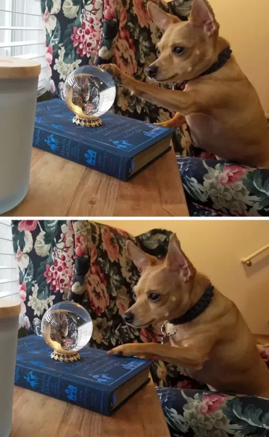 «Моя собака может видеть тротуар в отражении моего хрустального шара, поэтому она следит за людьми и машинами, но при этом выглядит так, будто видит будущее»