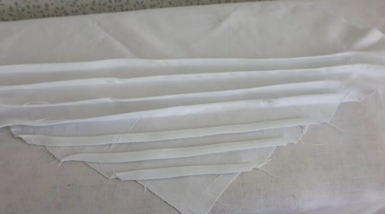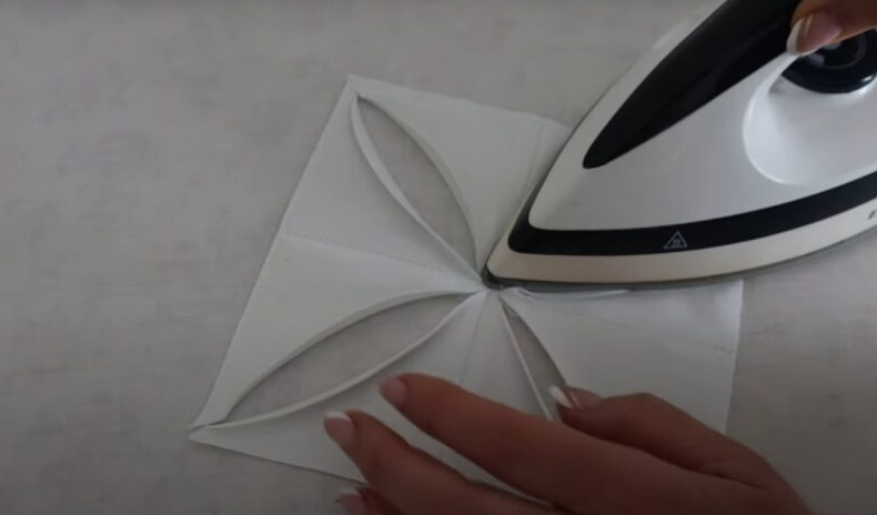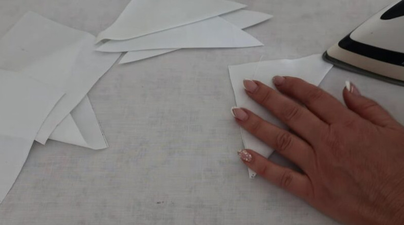Выкроите 8 квадратов с длиной стороны 11 см. Сверните квадраты по диагонали и прогладьте их.