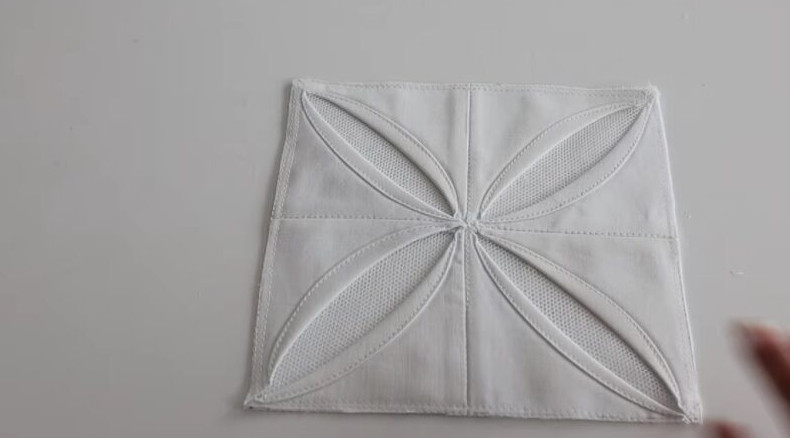 Получившиеся треугольник сложите как показано на фото и соедините их на швейной машине. В итоге получится квадрат. Проложите фиксирующую строчку по сторонам квадрата, тем самым соединив все части заготовки между собой. Каждую диагональ внутри разгладьте в обратную сторону.