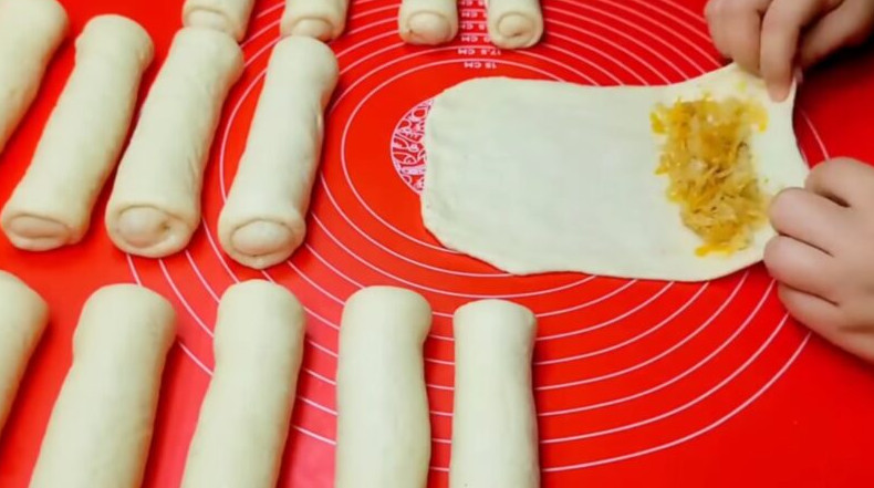 Разделите тесто на 15 равных частей, из каждой части сформуйте шарик. Раскатайте каждый шарик в тонкий пласт. На один из краев выложите начинку и сформуйте плотный рулетик.