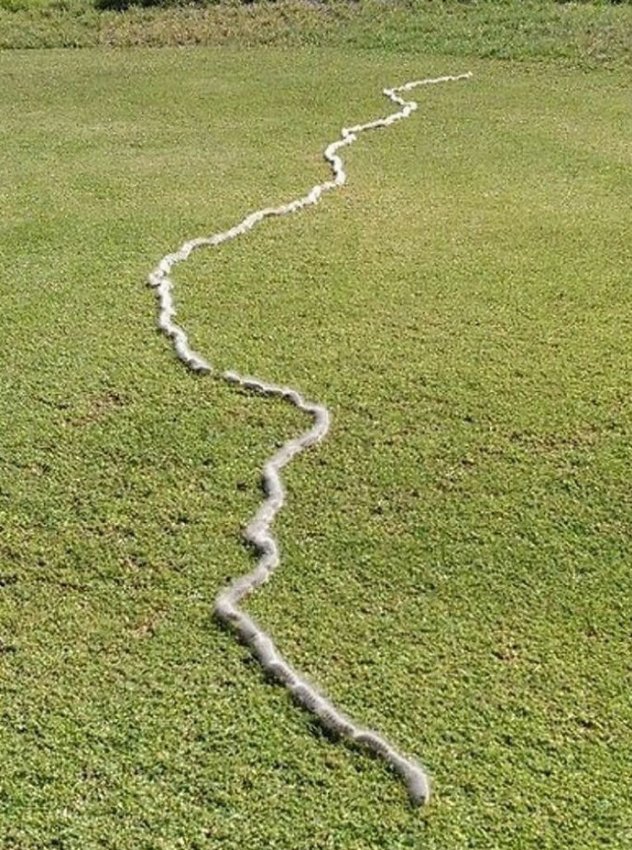 «Они гнездятся у оснований деревьев в огромных количествах, пытаясь найти новый источник пищи или подходящее место для окукливания и превращения в мотыльков. Почему в линию? Чтобы казаться более угрожающе, чтобы хищники держались подальше. Их пух также очень раздражающий на ощупь.»