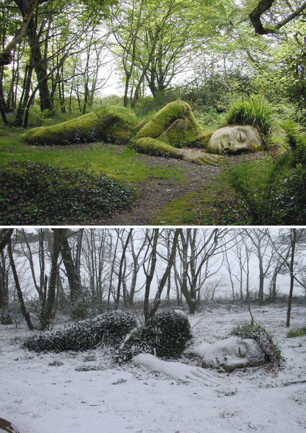 В зависимости от сезона «волосы» и «одежда» The Mud Maid меняются, когда сезонные растения и мох вырастают над скульптурой.