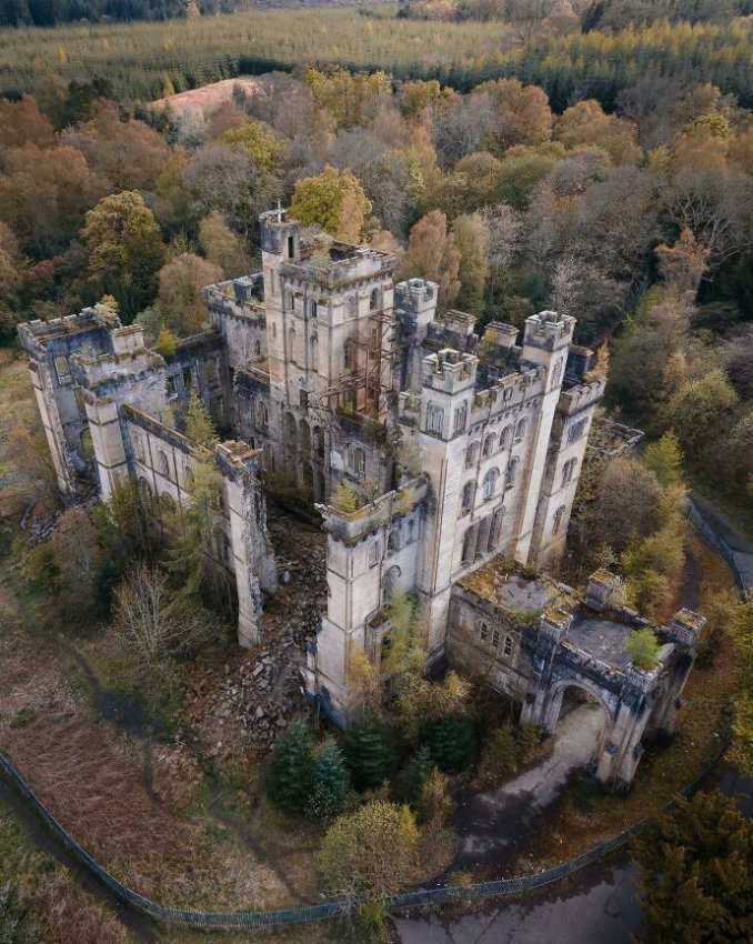«Построено Дэвидом Гамильтоном между 1837 и 1841 годами. Позже в нем размещалась больница Lennox Castle Hospital, школа для людей с трудностями в обучении. Место было известно ужасными условиями проживания, переполненностью, плохим обращением с пациентами и было заброшено в 2002 году. Оно сгорело во время пожара в 2008 году, что привело к обрушению деревянного потолка, плит пола и значительному повреждению кладки стен.»