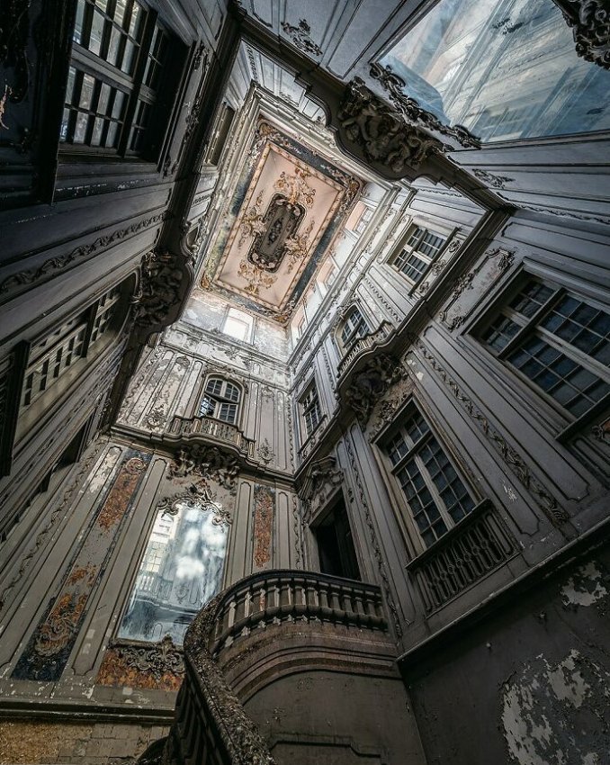 «Дворец Силва Амаду, Лиссабон, Португалия. Построен в 1800-х годах. Дворец был известен своими богато украшенными интерьерами и панелями из плитки. Здание было куплено португальским государством в 1928 году, которое в значительной степени испортило его и никогда не ремонтировало. В 2000-х годах, после многих лет запустения, дворец был куплен компанией по недвижимости, и город одобрил план частичного сноса, чтобы освободить место для жилых домов.»