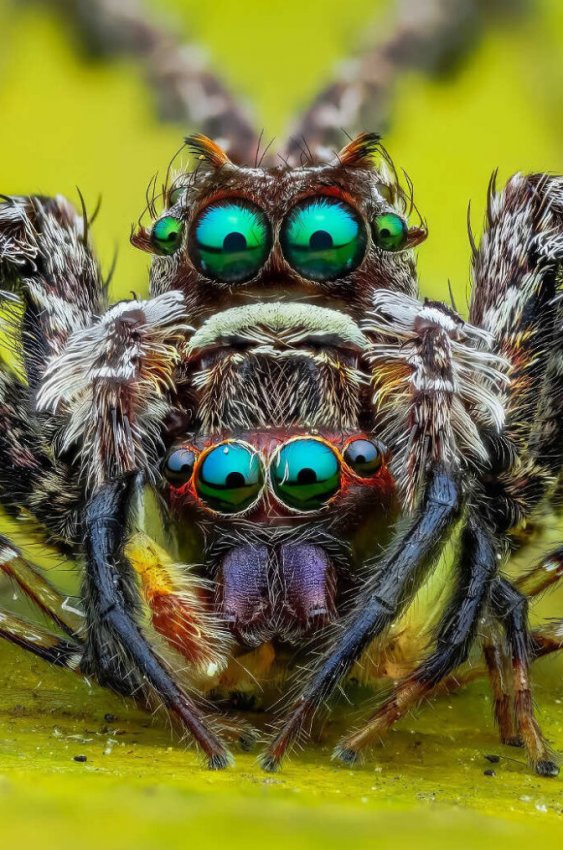 Этот паук выглядит как настоящий супергерой с армией глаз и решимостью на лице. Похоже, он готов защищать свой маленький мир от всех врагов!