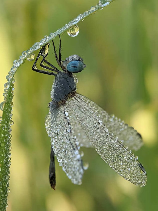 Эта стрекоза явно приняла утренний душ и теперь сияет, как настоящая звезда. Даже крылья покрыты мелкими каплями, словно драгоценными камнями!