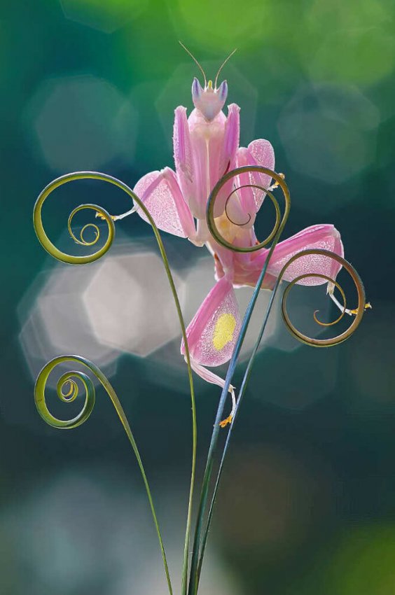 Орхидейный богомол словно позирует на сцене, окружённый изящными завитками. Такое чувство, что он только что окончил свой балетный номер и ждет аплодисментов!