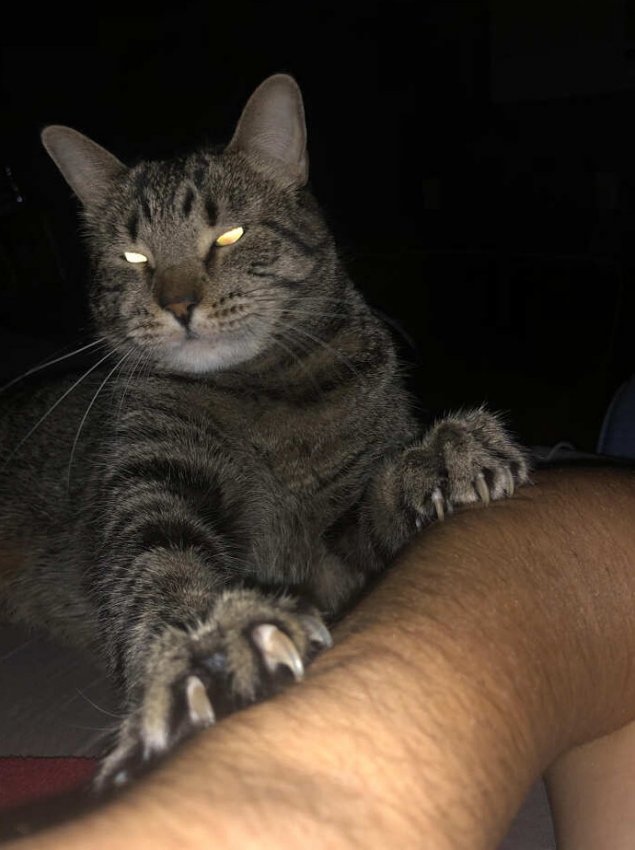 «Ой, ваша кошка просто царапает Вас? Наша любит душить нас своей жирной мякотью, пока мы не задохнемся, а потом она пытается засунуть нам в рот свои жалкие лапки, чтобы мы поняли, что она голодна… Это мило, и я с нетерпением жду этого каждое утро. Ха-ха.»