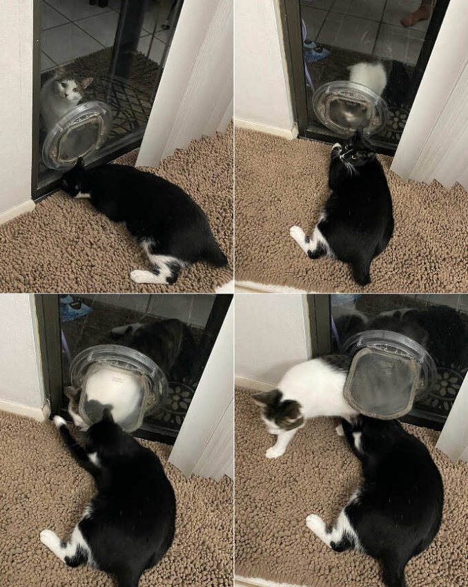 «Одному из моих котов нравится лежать перед кошачьей дверью и кусать своих собратьев, когда они пытаются пройти через нее»