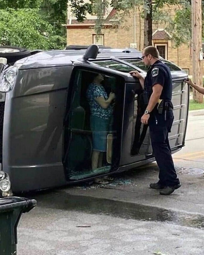 Ну что, мадам, просто неправильно рассчитали скорость при повороте, да? Полицейский, видимо, готов дать ещё один шанс на исправление.
