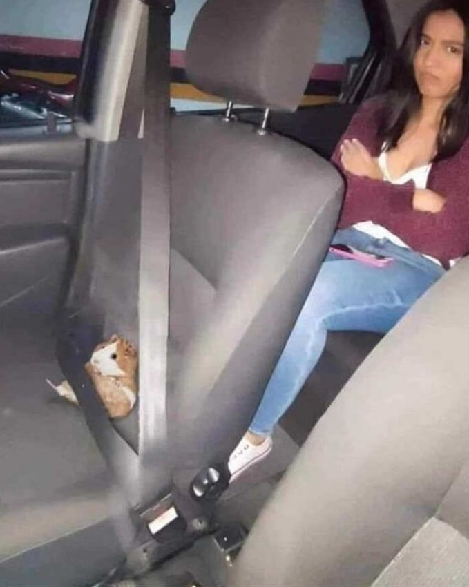 Девушка явно обижена, что хомяк занял лучшее место и пристёгнут с особой заботой, а её даже не спросили.