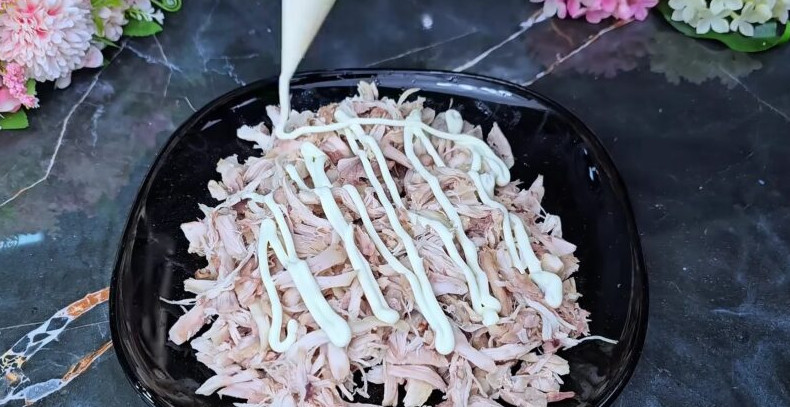 Отварную курицу нарежьте на кусочки, соедините со столовой ложкой майонеза и выложите в форме треугольника на красивое блюдо.