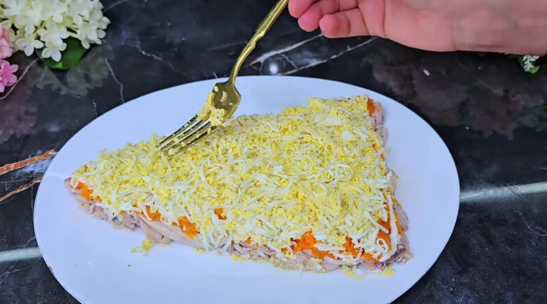 Вторым слоем выложите немного майонеза и натертую на мелкой терке отварную морковь. Третий слой — майонез и натертые на мелкой терке вареные яйца.