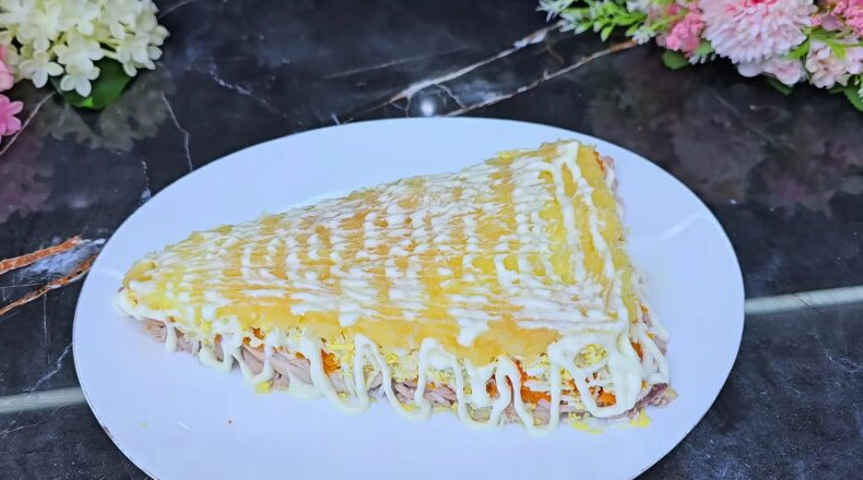 Очень простой в приготовлении салат не оставит никого равнодушным. Гости будут в восторге как от внешнего вида закуски, так и от оригинального вкуса и интересного сочетания продуктов.