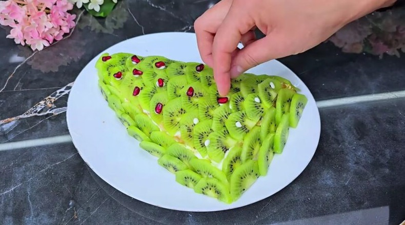 Для оформления салата потребуются киви, нарезанные полукольцами, и зерна граната.