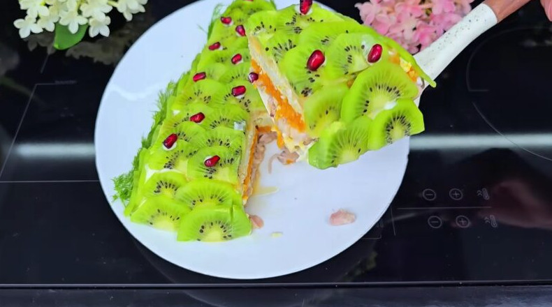 Пришло время планировать меню на новогодний стол, ведь до главного праздника осталось совсем немного времени. Помимо всеми любимых оливье и селедки под шубой предлагаем приготовить оригинальный салат — «Новогодняя елка», который, без сомнения, станет «изюминкой» праздничного стола. Gotovim s Asmoy/youtube Необходимые ингредиенты курица отварная — 300 гр; морковь отварная — 1 шт; яйца отварные — 3 шт; зеленое яблоко — 1 шт; киви — 3 шт; зерна граната; майонез — по вкусу. Способ приготовления Отварную курицу нарежьте на кусочки, соедините со столовой ложкой майонеза и выложите в форме треугольника на красивое блюдо. Gotovim s Asmoy/youtube Вторым слоем выложите немного майонеза и натертую на мелкой терке отварную морковь. Третий слой — майонез и натертые на мелкой терке вареные яйца. Gotovim s Asmoy/youtube Четвертый слой — майонез и натертое зеленое яблоко без кожуры. Gotovim s Asmoy/youtube Для оформления салата потребуются киви, нарезанные полукольцами, и зерна граната. Gotovim s Asmoy/youtube Очень простой в приготовлении салат не оставит никого равнодушным. Гости будут в восторге как от внешнего вида закуски, так и от оригинального вкуса и интересного сочетания продуктов. Gotovim s Asmoy/youtube