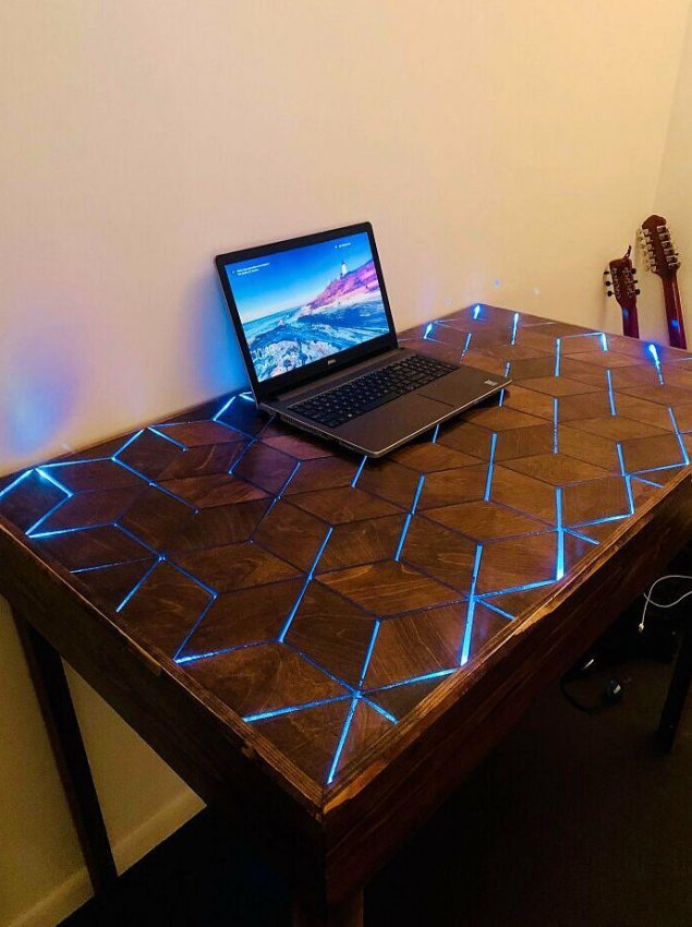 «Деревянный/светодиодный стол, который я сделал из обрезков. Зазоры заполнены прозрачной эпоксидной смолой, поэтому вся поверхность гладкая»