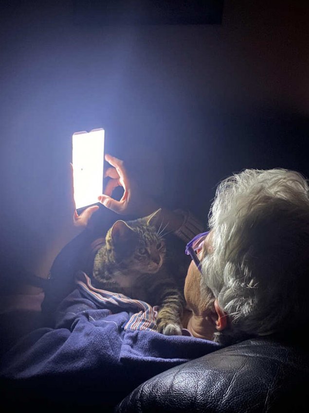 Кот в ночной тишине слушает лекцию о смысле жизни. Возможно, телефонное сияние открыло ему новые горизонты.