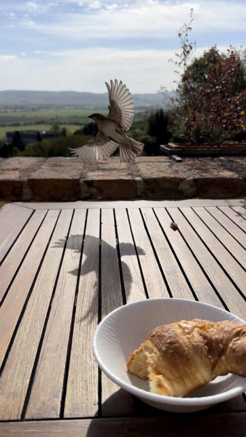 Пернатый воришка нацелен на круассан. Кажется, это его лучший завтрак на свежем воздухе!