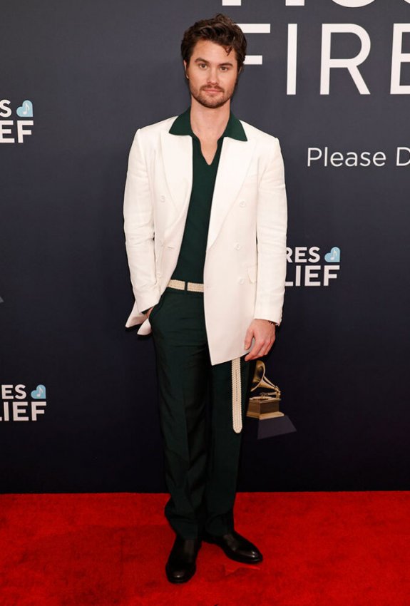 Чейз Стоукс, безусловно, попал в точку, когда он подошел к своей номинированной на Грэмми девушке Келси Баллерини на красной дорожке. Он был одет в черные брюки и рубашку, а сверху надел белый пиджак, который сочетался с ее черным мини-платьем, а через руку была перекинута белая атласная шаль.