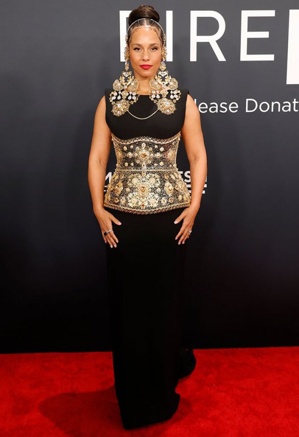 Если бы была премия Грэмми за мега-аксессуары, Алиша Киз определенно забрала бы ее домой. Черно-золотой наряд дополняли свисающие серьги, от которых люди не могли оторвать глаз.