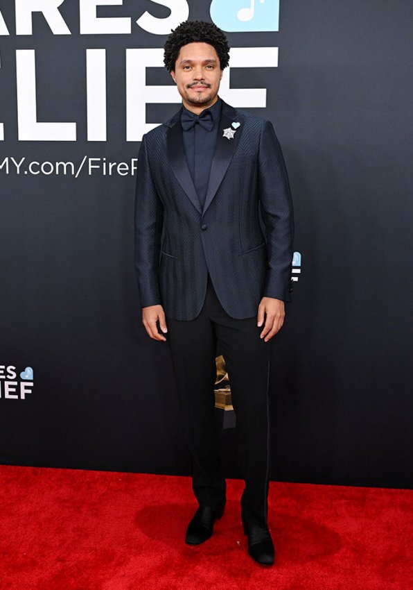 Ведущий вечера Тревор Ноа позировал перед камерами на красной дорожке в своем темно-синем вечернем пиджаке Giorgio Armani с шевронным узором тон в тон. Великолепный образ дополняли соответствующая рубашка, брюки и галстук-бабочка, что стало для комика пятым подряд годом в качестве ведущего ежегодного награждения.