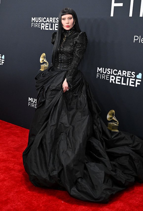 Не было недостатка в драме и готике, когда Леди Гага вышла на красную дорожку в черном бальном платье от Сэмюэля Льюиса. Изысканный дизайн включал высокий воротник, структурированные и пышные рукава, кожаный лиф, объемную юбку и шлейф до пола, который следовал за ней.
