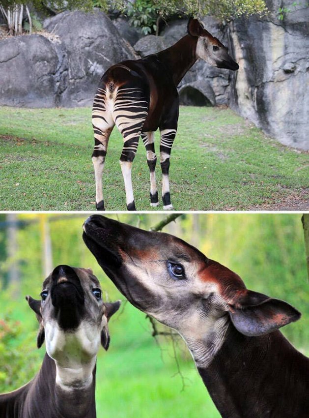 Это млекопитающее обитает в Демократической Республике Конго, в Центральной Африке. Несмотря на полоски, как у зебры, на самом деле он более близок к жирафам. Окрас шерсти окапи варьируется от шоколадного до красновато-коричневого, резко контрастируя с белыми горизонтальными полосами, кольцами на ногах и белыми лодыжками.