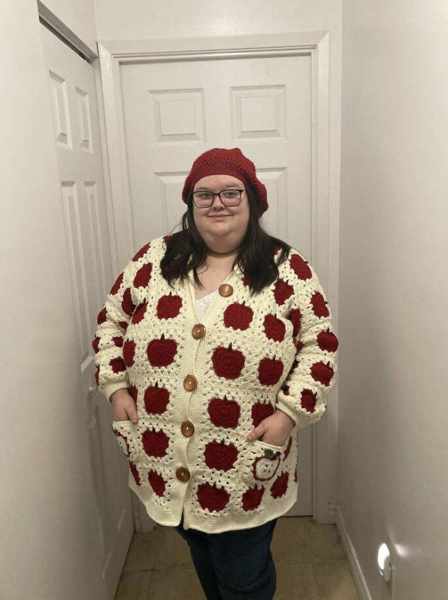 «Вязаный крючком кардиган в виде яблока и соответствующая шапка»