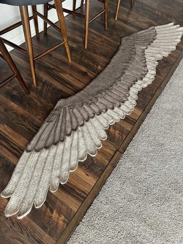 «Я купила эту схему вязания крючком год назад, потому что наткнулась на нее и очень хотела свою собственную шаль с крыльями! Только одна проблема: я не умела вязать крючком. И так эта схема пролежал у меня целый год. Затем я наконец-то добралась до того, чтобы самостоятельно освоить основы вязания крючком и научиться читать схему. Это мой второй проект по вязанию крючком по схеме. ? Я использовала пряжу из смеси шерсти и акрила, камвольную пряжу трех разных оттенков коричневого цвета. Этот узор был фантастическим. Каждое перо казалось достижением, и все было так хорошо объяснено, что все получилось само собой. В общей сложности, я думаю, это заняло около 50 часов за 3 недели.»