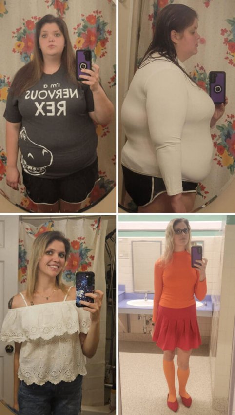 «Я похудела с 270 кг до 86 кг! С тех пор я достиг своего желаемого веса и удалил часть дряблой кожи на животе и шее. Я действительно чувствую себя другим человеком! Я набрал вес после 6 лет абьюзивных отношений и был в тяжелой депрессии. Перестал ходить на занятия и видеться с семьей и друзьями. Потом я начал ходить на терапию и научился подсчитывать калории и готовить правильную еду.»