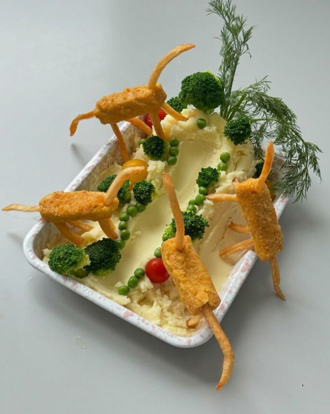 На этой тарелке — целое сафари из картошки фри и брокколи. Осторожно: эти ребята быстро убегают, если вы подкрадётесь с вилкой!