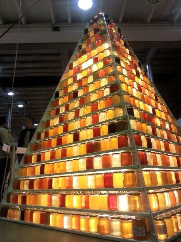 Лондонские пчеловоды построили гигантскую пирамиду из меда с подсветкой, чтобы продемонстрировать все его оттенки