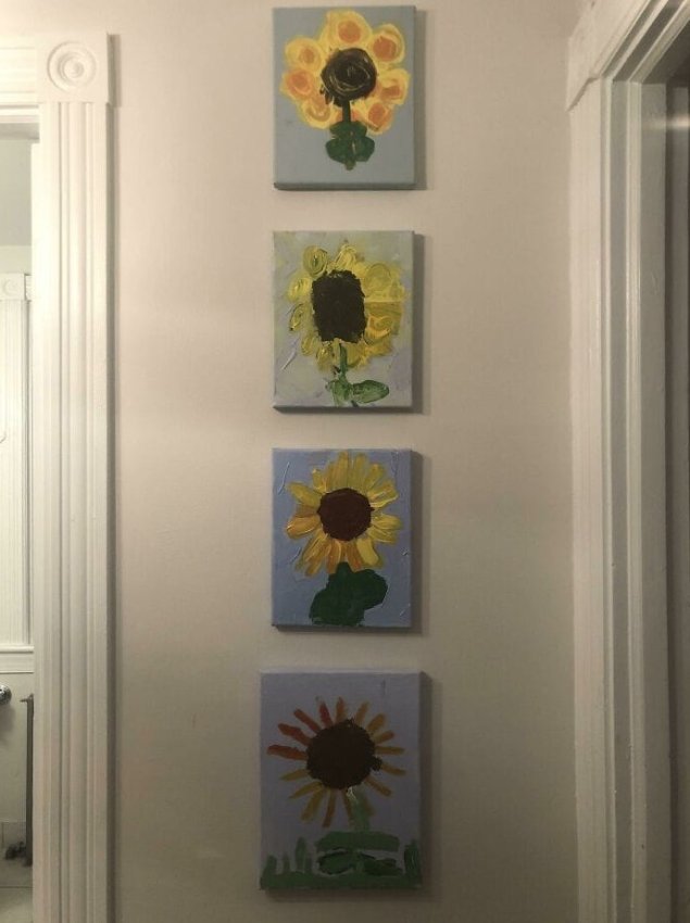 4 картины с изображением одного и того же подсолнуха, написанные каждым из моих 4 детей, все они были нарисованы в одном и том же возрасте 5 лет