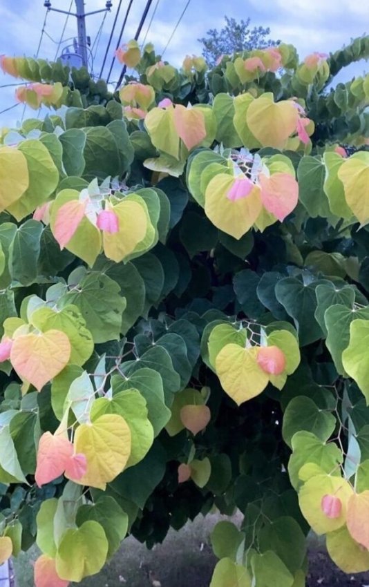 Это не фотошоп и не реклама мармелада — просто природа решила немного пошалить с палитрой. Листья переходят из зелёного в жёлтый, затем в розовый, как будто дерево собрало всю весну на одной ветке. Оно будто кричит: «Смотрите, я умею в пастель!»