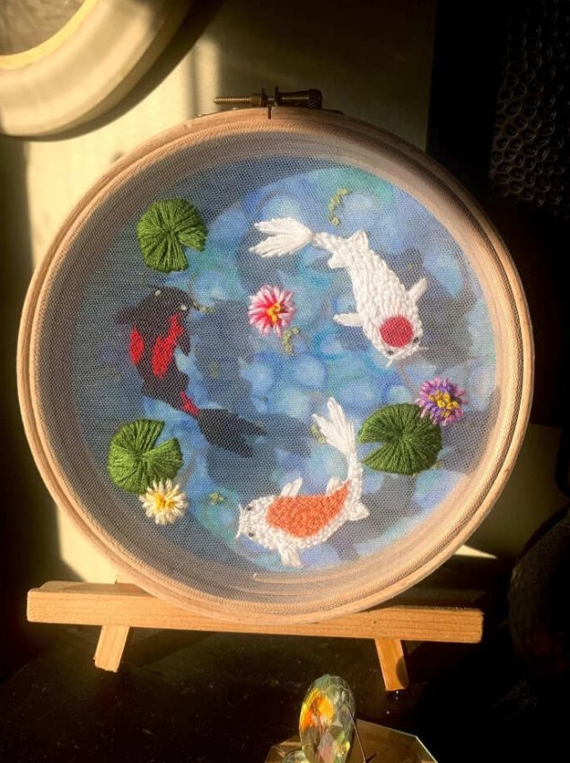 Кажется, что koi-рыбки вот-вот всплывут и потребуют ужин. Объём, свет и прозрачность создают почти магический эффект воды. А вышивать по сетке — это как рисовать акварелью, только нитками и с терпением Будды.