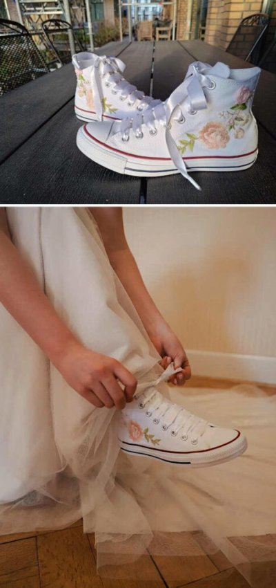 Свадебные кеды — для невест, которые не готовы жертвовать комфортом ради каблуков, но хотят быть самыми стильными. Розы на белом фоне делают их одновременно дерзкими и трогательными. И да, в них удобно танцевать до утра.