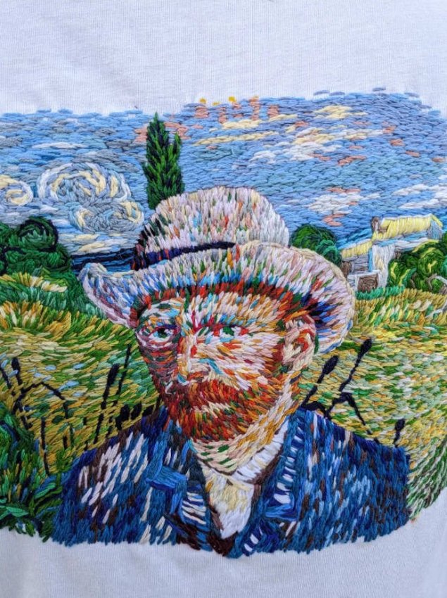 Похоже, Винсент сбежал с холста прямиком на футболку. И хотя у него опять слегка поплыло лицо, это не безумие — это текстильное искусство! Сочетание живописи и ниток — гениальное, как и сам автор сюжета. Такое точно не увидишь в музее, но захочешь носить каждый день.