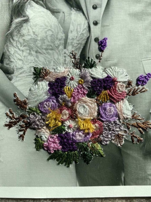 Зачем довольствоваться фотографией, если можно добавить к ней объёма, ниток и настоящего волшебства? Этот свадебный букет выглядит так, будто его можно понюхать. Такая вышивка — это когда ты не просто вспоминаешь день свадьбы, а тактильно его ощущаешь.