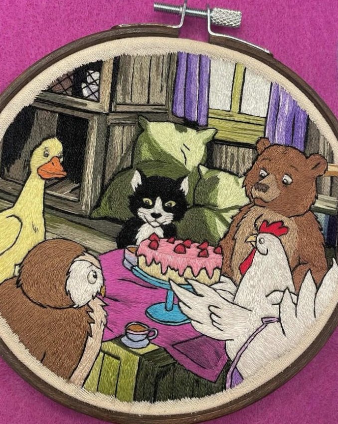 Котик, медведь, курица и утка собрались за столом. Почему? Никто не знает, но у них есть торт, вышивка и прекрасное чувство абсурда. Это вышитая версия сна, после вечернего чая с вареньем.