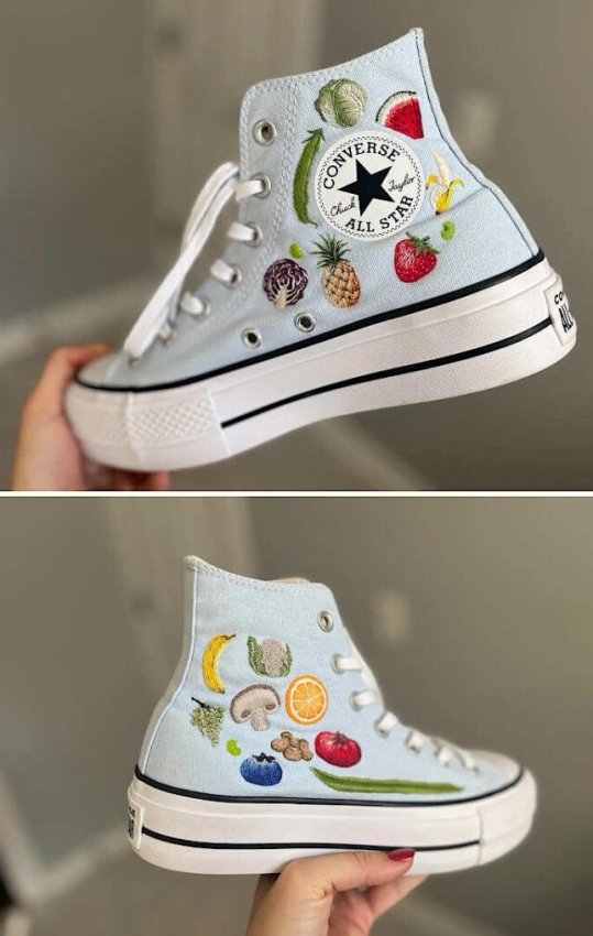 «Каждый вышитый элемент на обуви представляет любимый фрукт или овощ близкого человека (или фасоль пинто, если это мой дедушка ?). Есть даже маленькие вышитые зеленые бобы для детей моих друзей!»