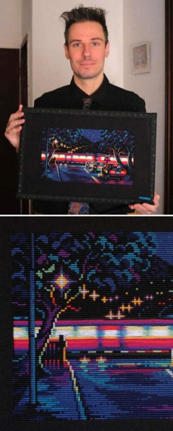 «Я подумал, что было бы интересно запечатлеть свет и движение с помощью вышивки: я использовал прямой/вертикальный гобеленовый стежок для «статичных» частей и гладь для движущегося поезда. Вся сцена выполнена 11 цветами. Я очень доволен результатом и хотел поделиться им с вами!»
