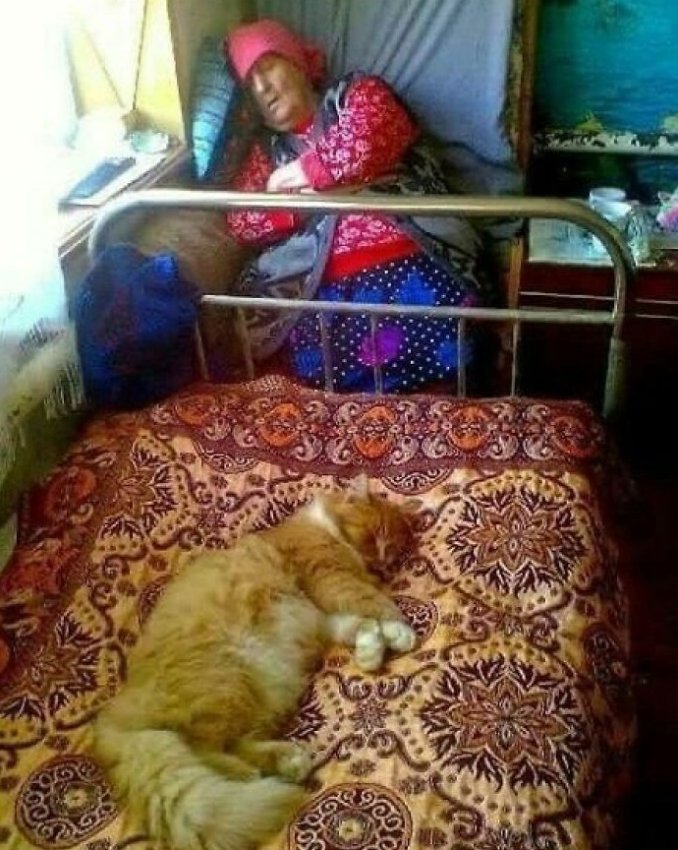 Два уровня комфорта на одном матрасе. Один в орнаменте и шерсти, другой — в платке и уютах. Кто из них хозяин постели, вопрос философский.