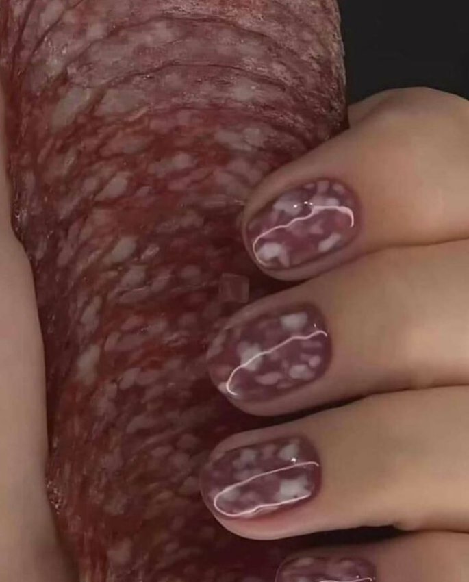 Иногда ногти выглядят так аппетитно, что хочется их съесть. В прямом смысле. Дизайн «салями люкс» — новое слово в мире гламура. Осторожно: вызывает неконтролируемый голод.