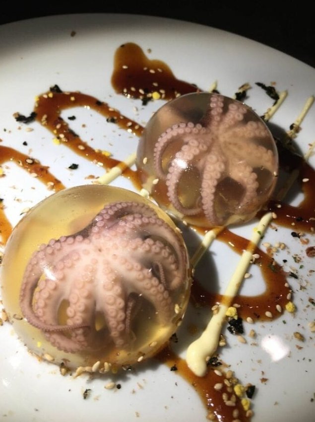Маленькие осьминоги в желейных шарах — это десерт, способный разрушить детство. Выглядит как закуска из фантастического триллера про инопланетян. Грани между едой и зоологическим экспериментом тут размыты. Зато прозрачность блюда — на высоте.