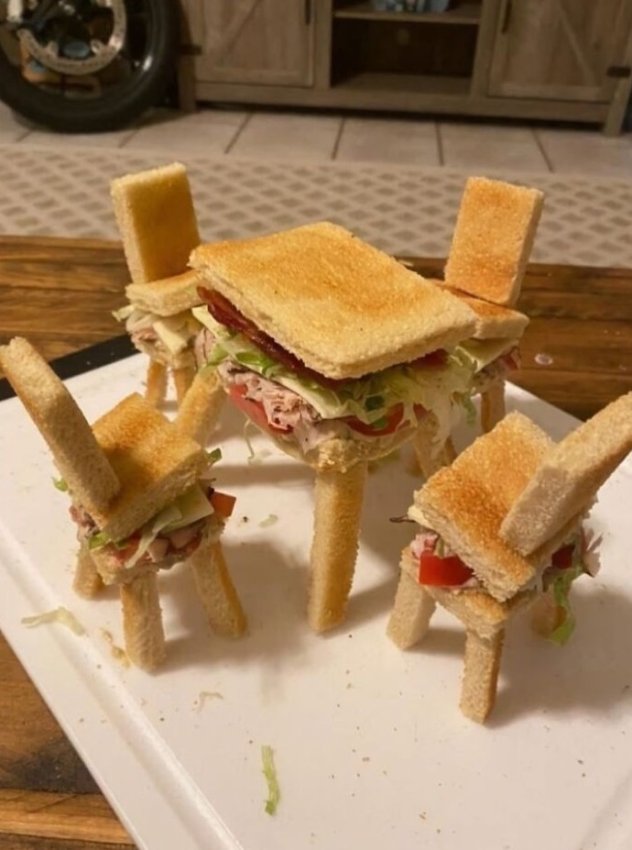 Кто-то не просто сделал бутерброд, а построил целую мебельную группу. Сэндвич-стол и бутербродные стулья — пик хлебной архитектуры. Очень креативно, но как это вообще есть — непонятно. Хочется добавить: «Пожалуйста, не сидите на еде».