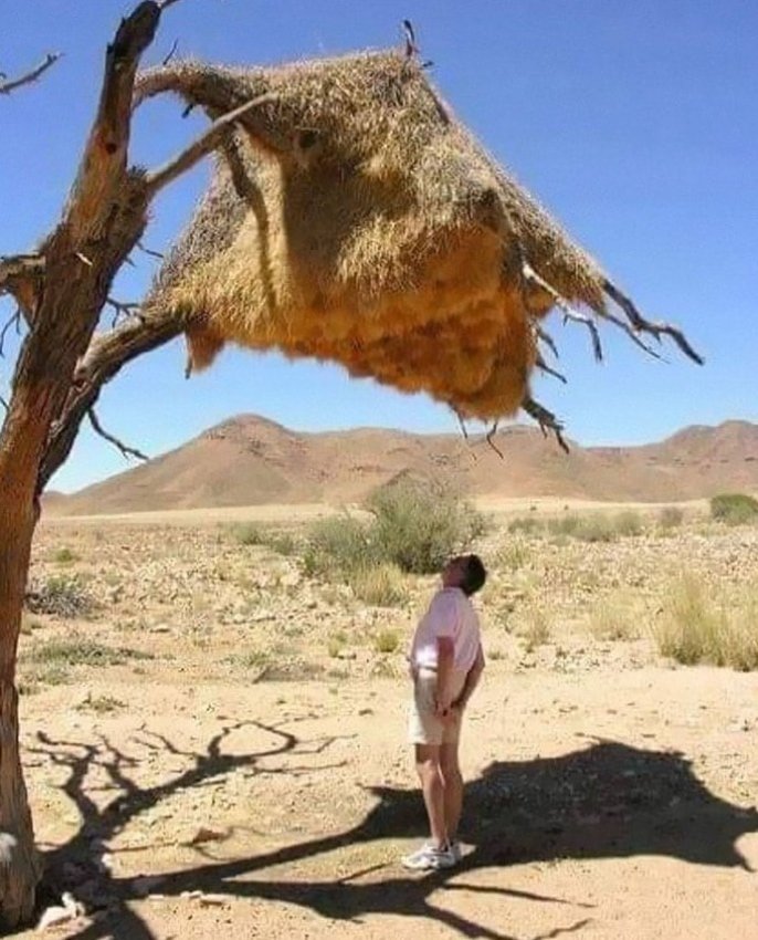 Общительный ткач (Philetairus socius) – вид птиц семейства ткачиковых, обитающий в Южной Африке, Намибии и Ботсване. Этот вид строит большие многоквартирные гнёзда, напоминающие хижины, с покатой крышей из соломы, которая защищает от дождя. Эти гнёзда – самые большие и самые населённые дома на деревьях в мире: некоторые из них весят до тонны и более, достигают 6 метров в ширину и 3 метров в высоту.