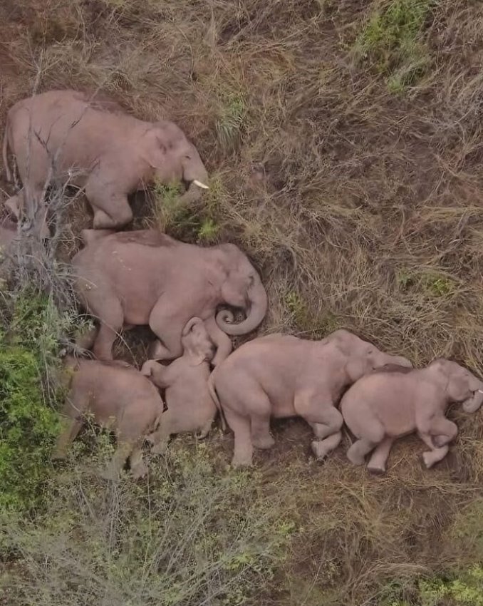 Семья слонов спит рядом друг с дружкой, снято дроном.