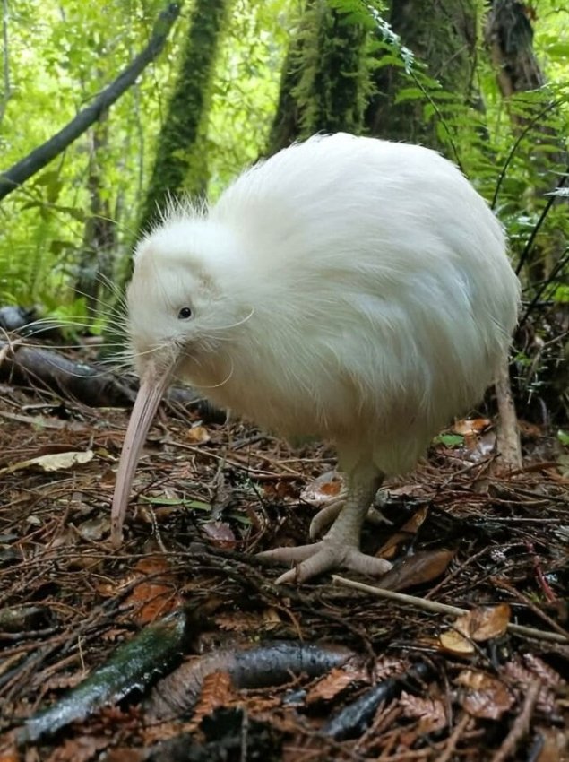 Это КИВИ-АЛЬБИНОС, если вы никогда его не видели. Это Мапуна, редкий белый киви, живущий в Центре дикой природы Пукаха в Новой Зеландии. Киви — культовые нелетающие птицы, известные своими длинными клювами и невероятным обонянием. Белые киви, такие как мапуна, встречаются крайне редко, что делает это зрелище поистине особенным!
